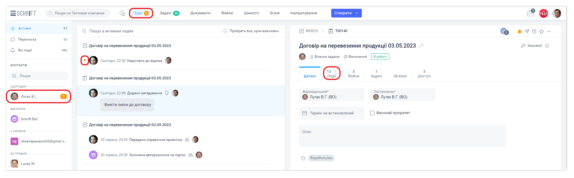 Якщо ввімкнено фільтр за контактом, то за об'єктом буде показана остання подія комунікації з цим контактом та перебудована хронологія відповідно до дат таких комунікацій. Достатньо клікнути на аватар контакту і відобразяться тільки ті об'єкти, за якими у вас є з ним переписка.