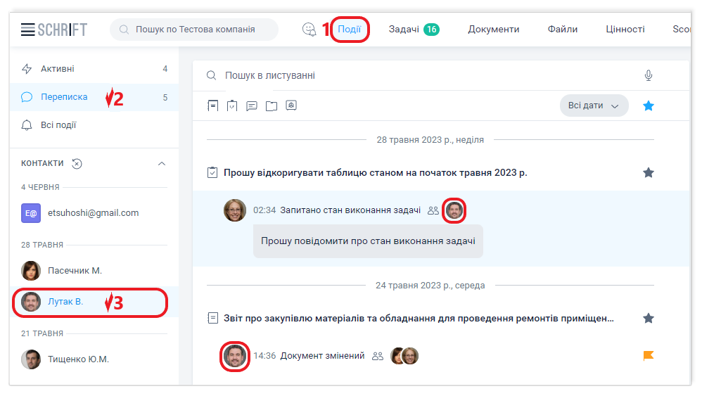 Фільтр Переписка показує в центральній стрічці список об'єктів разом з останньою подією за вашою участю і хронологічно відсортований за ним.