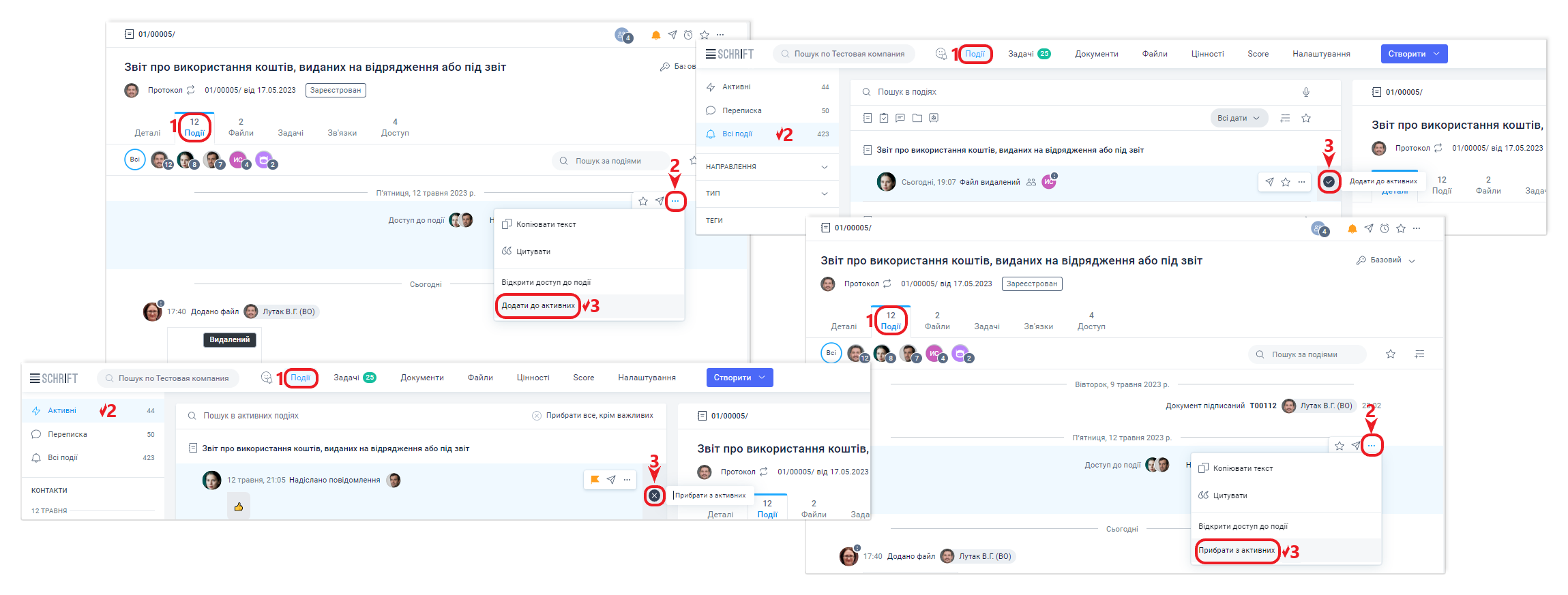 Тому ми рекомендуємо приділяти увагу перегляду стрічки Активних подій і залишати там мінімальну кількість подій, які все ще потребують ухвалення щодо них рішення, та прибираючи відпрацьовані події (інформація вже взята до відома і дії не потрібні, або надано відповідь, або створено задачу для подальшої роботи).