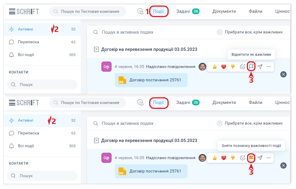 Вхідна подія, надіслана зі сповіщенням, тобто така, що потребує прочитання, потрапляє у фільтр Активні в очікуванні її прочитання. Лічильник нових подій відображається біля найменування розділу Події помаранчевим кольором. Крім цього, біля кожного рядка контактів показано скільки нових подій від цього контакту до вас надійшло.