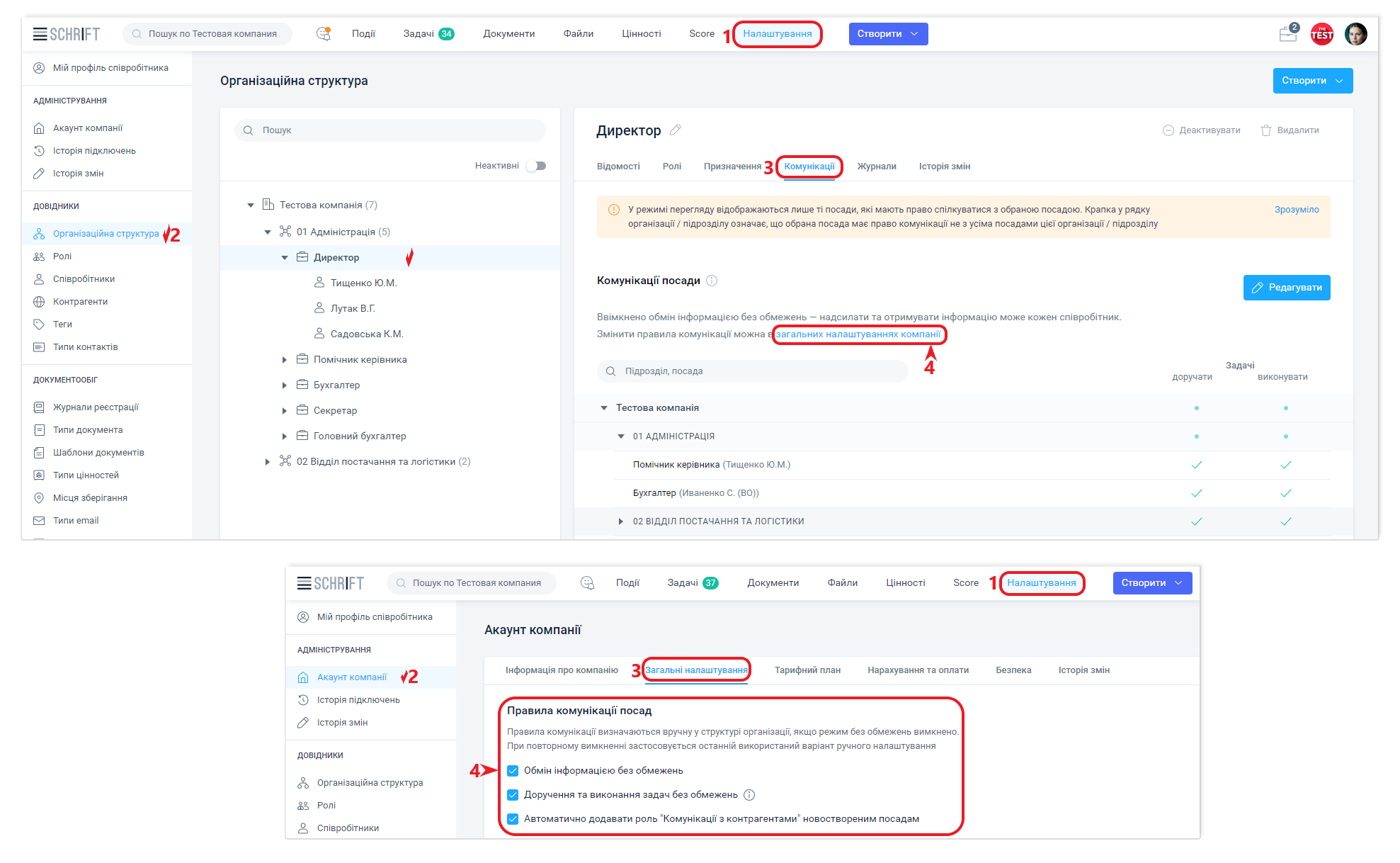 За замовчуванням у компанії всі посади можуть взаємодіяти між собою без обмежень інформаційно та ставити задачі, тобто режим без обмежень.