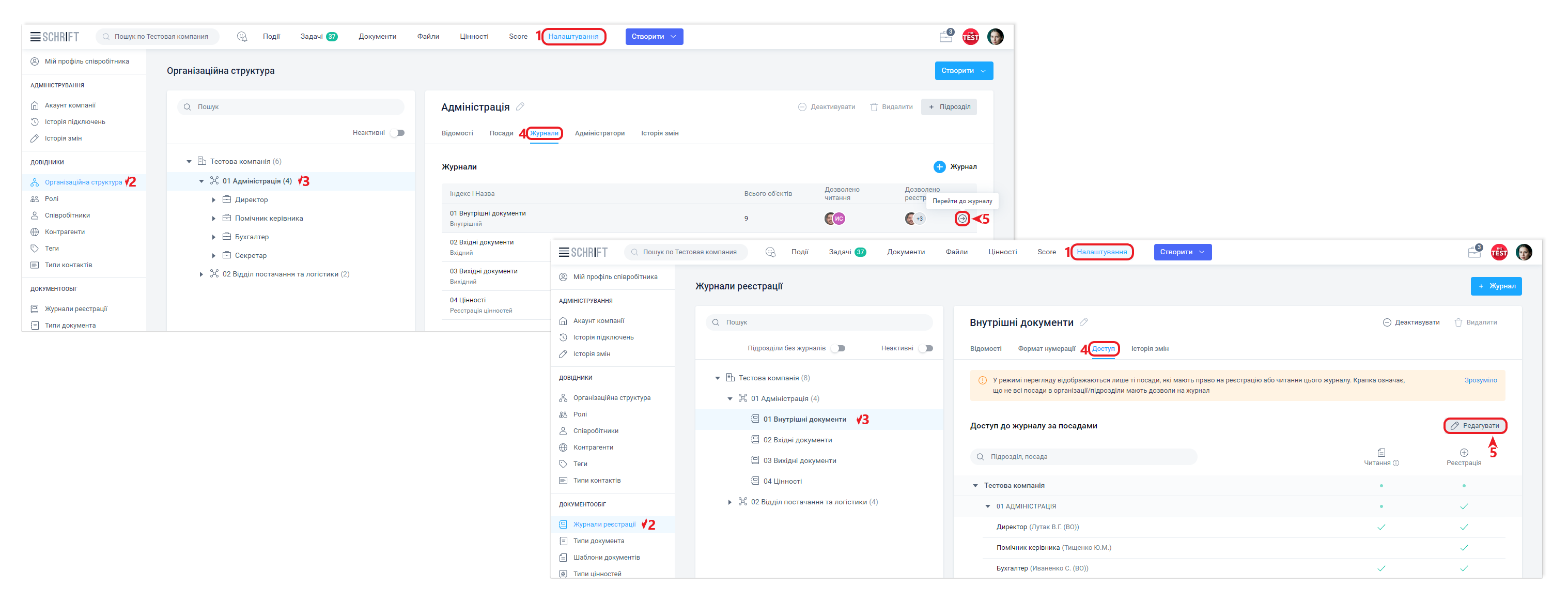 За замовчуванням посада отримує право на реєстрацію в журналах підрозділу, в якому створюється ця посада. Якщо в підрозділі, в якому створена посада, не створювався набір журналів, то в цьому разі знадобиться ручне налаштування доступу посади до журналів реєстрації іншого підрозділу.