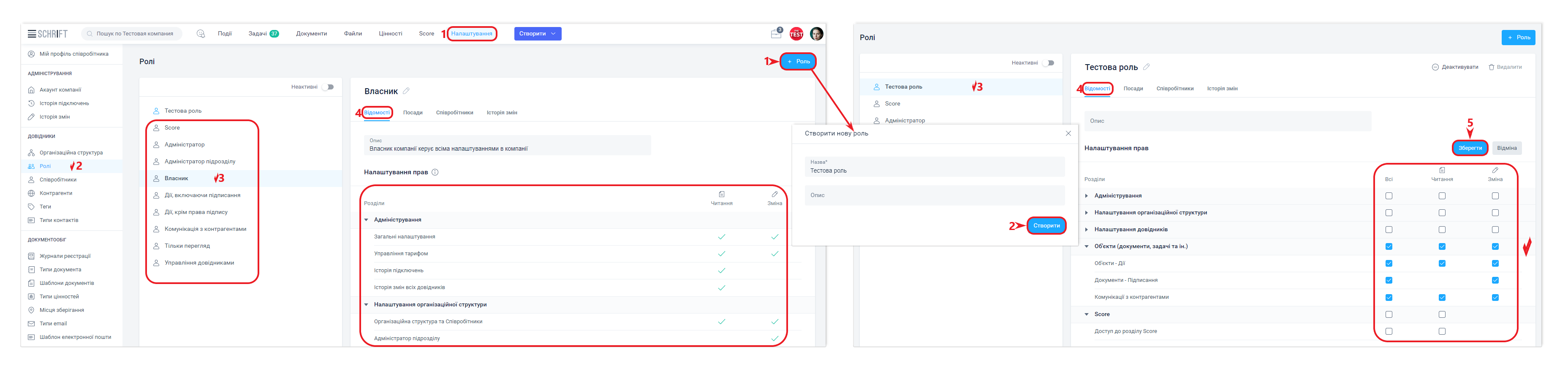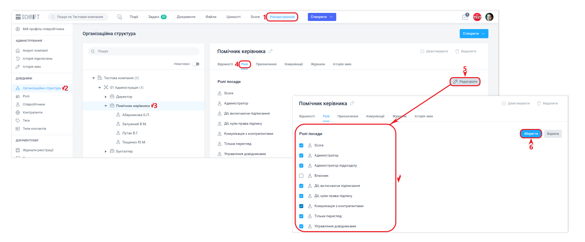 Додайте ролі тим посадам, які повинні мати доступ до всього акаунту компанії (адміністратори), до управління окремими підрозділами (адміністратори підрозділів), до налаштування всіх або окремих довідників, правом зовнішніх комунікацій і т.д.