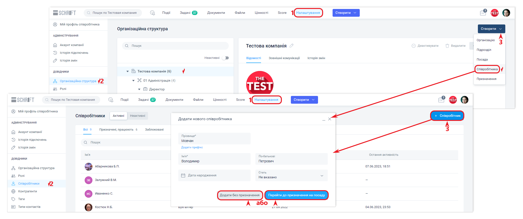 Налаштування організаційної структури, створення посад, призначень та додавання співробітників