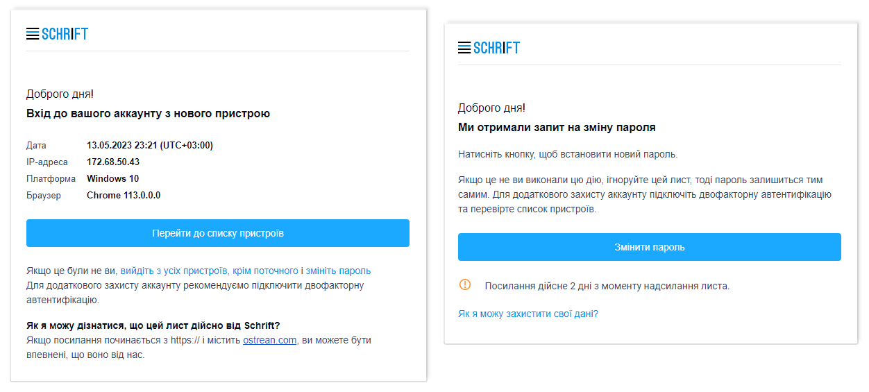 Ідентифікація пристрою. Пристрій, який використовується для входу, ідентифікується системою. У разі доступу з нового пристрою, на email користувача надсилається повідомлення з детальною інформацією про підключення. Перелік усіх пристроїв, з яких підключався користувач, і керування ними, доступний в акаунті користувача.