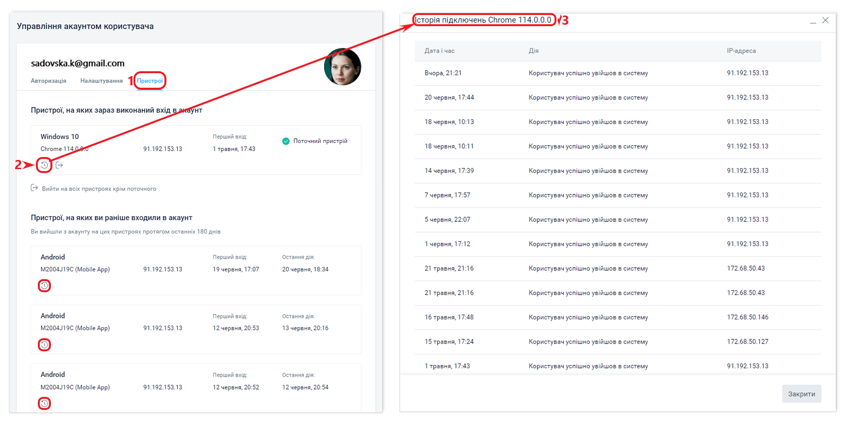 Система дає можливість переглядати та управляти списком пристроїв, з яких виконувався вхід у систему. Ви можете відстежити всю історію під'єднань із кожного пристрою, з якого було виконано вхід у систему.