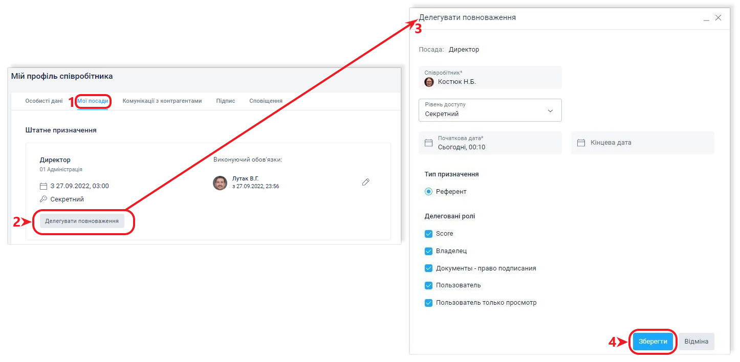 Система автоматично надасть виконувачу обов'язків доступ до інформації вашої посади в обраний вами час і в зазначений момент припинить його. Під час делегування доступу до посади, тобто при створенні призначення відповідному співробітникові, може бути обраний не тільки період, а й ролі, які надаються та рівень доступу.