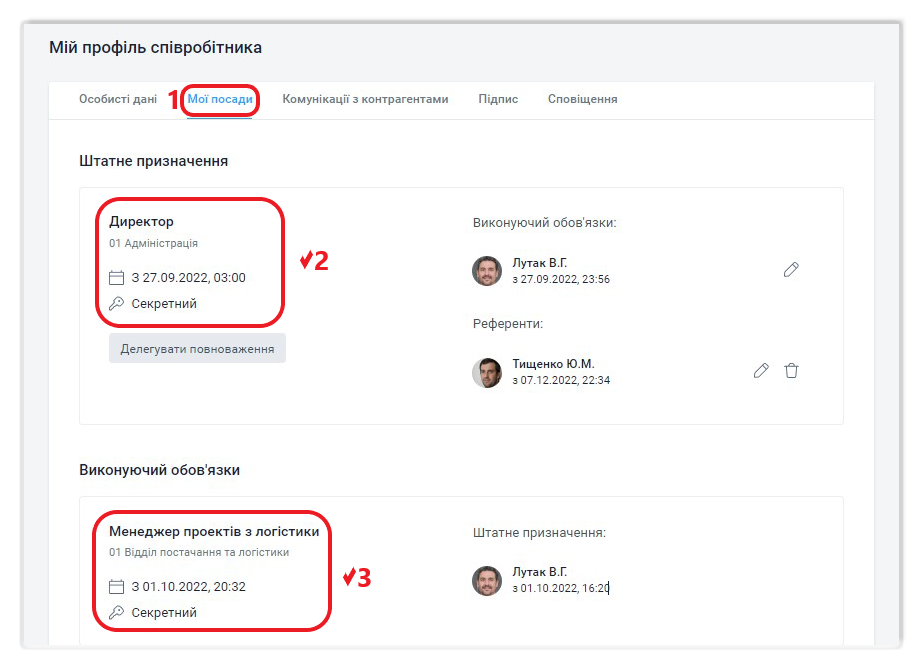 Дія з делегування повноважень доступна тільки для співробітників, які мають щодо цієї посади штатне призначення. Додавати, змінювати та видаляти призначення можуть також адміністратори компанії.