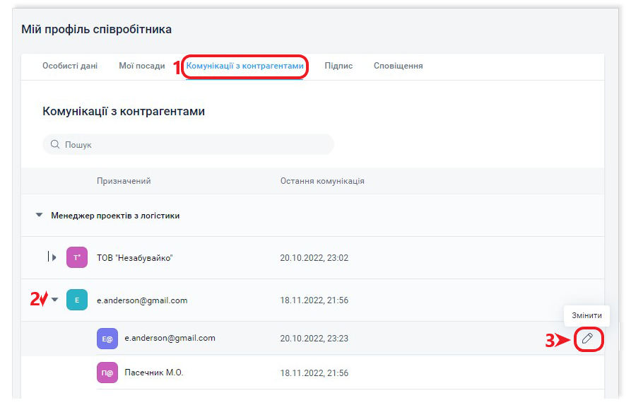 Співробітник може керувати, змінювати або доповнювати відомості про контрагентів і контактів, а також блокувати та розблокувати комунікацію з ними.