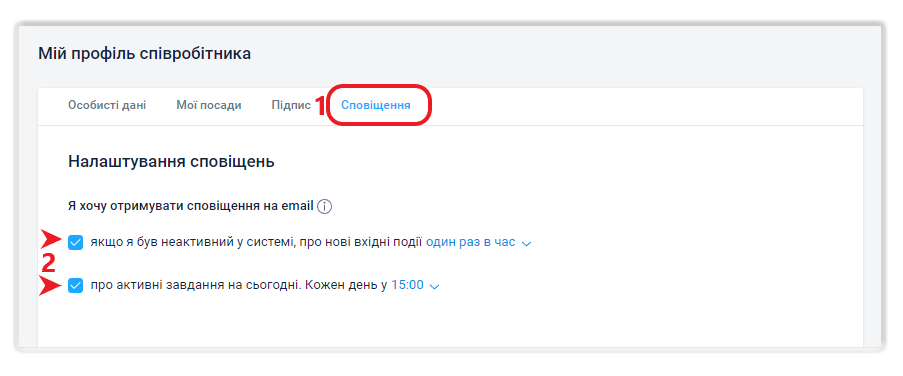 У системі є можливість сповіщення про події, що потребують прочитання, на електронну пошту, і кожен користувач може налаштувати свій режим сповіщень про нові події та “активні задачі на сьогодні” або вимкнути їх.