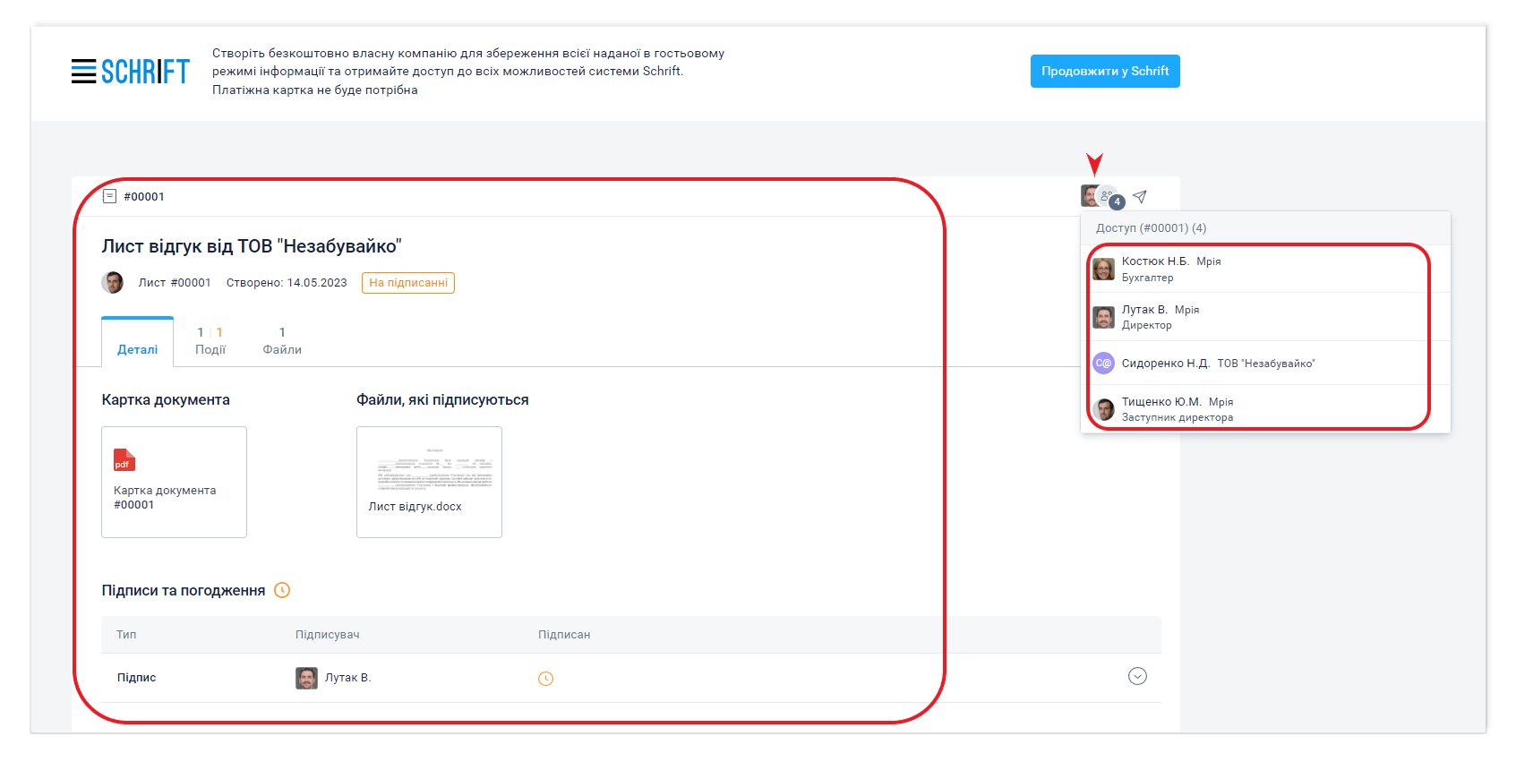 У гостьовому інтерфейсі співробітник контрагента може переглядати інформацію та виконувати мінімальний набір дій, зокрема підписати документ. Посилання залишатиметься доступним необмежений час, але якщо компанія-джерело закриє доступ до об'єкта за посиланням, то у гостя доступ припиниться.