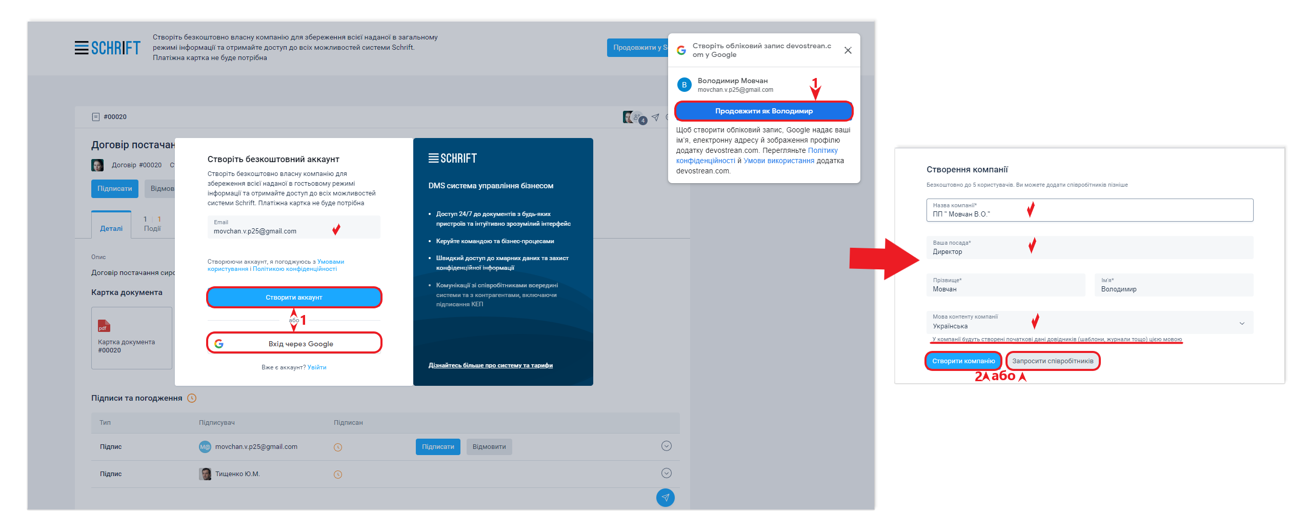 Якщо ваш партнер ще не використовує систему Шрифт, ви можете надіслати йому документ. Для цього потрібно створити контакт і вибрати його як одержувача документа. Можна вказати емейл контакту і тоді йому на пошту прийде лист із посиланням на документ. Якщо ви не знаєте емейл контакту або контакт не може знайти лист із посиланням у своїй пошті, можна скопіювати посилання в інтерфейсі та переслати його контакту будь-яким зручним для нього способом. Перейшовши за посиланням, контрагент потрапляє в гостьовий інтерфейс системи.