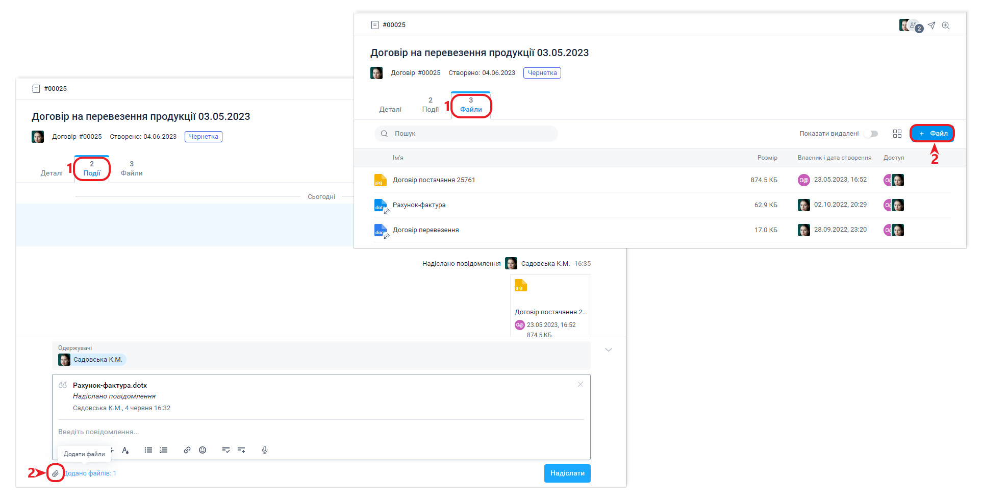Додати нові файли контрагент може як прикріпивши файл до повідомлення, так і в табі файли, завантаживши їх зі свого пристрою.