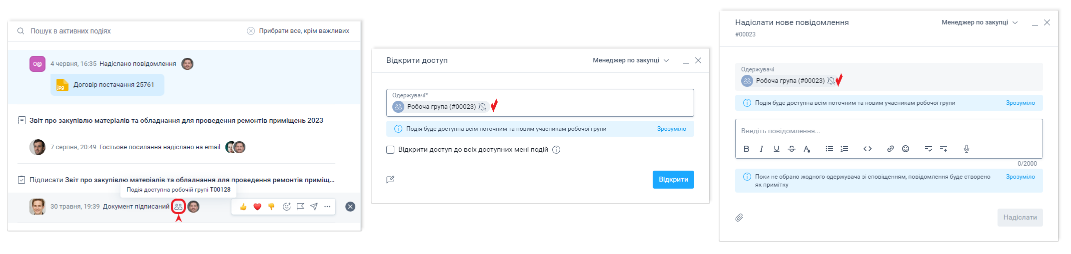 Якщо потрібно, щоб усі події були доступні всім учасникам робочої групи своєї компанії, то можна увімкнути "Пропонувати доступ робочій групі до нової події". Тоді при відкритті доступу, надсиланні повідомлення та ін. в поле "Одержувачі" буде автоматично додаватися Робоча група. Коли цю функцію вимкнено, то відкрити доступ для всієї робочої групи до нової події можна вручну, вказавши в одержувачах Робочу групу.