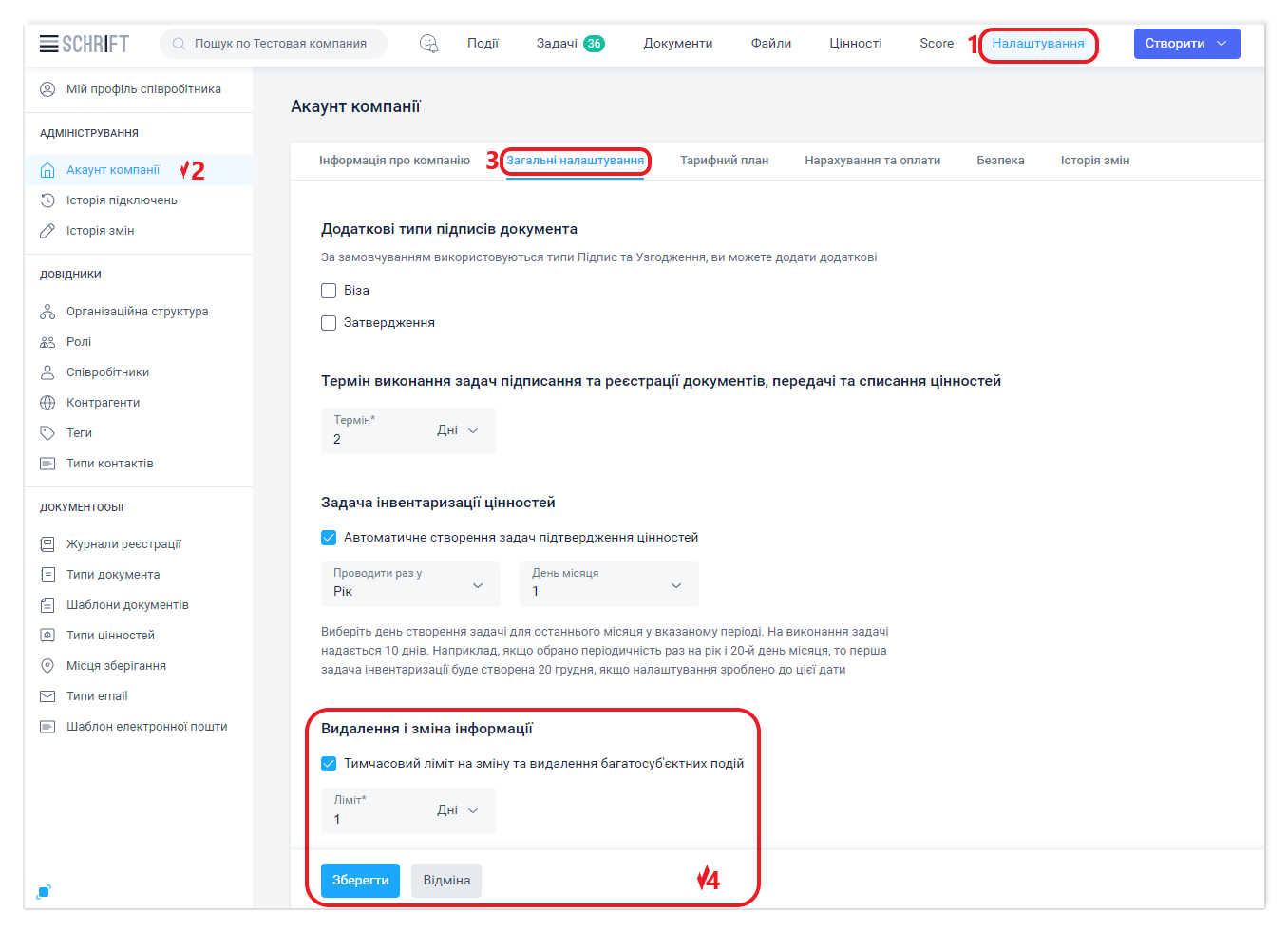 За замовчуванням у компанії встановлено термін виконання для задач підписання та реєстрації документів, передачі та списання цінностей у 2 дні. Цей параметр можна змінити, встановивши відповідний для процесів вашої компанії.