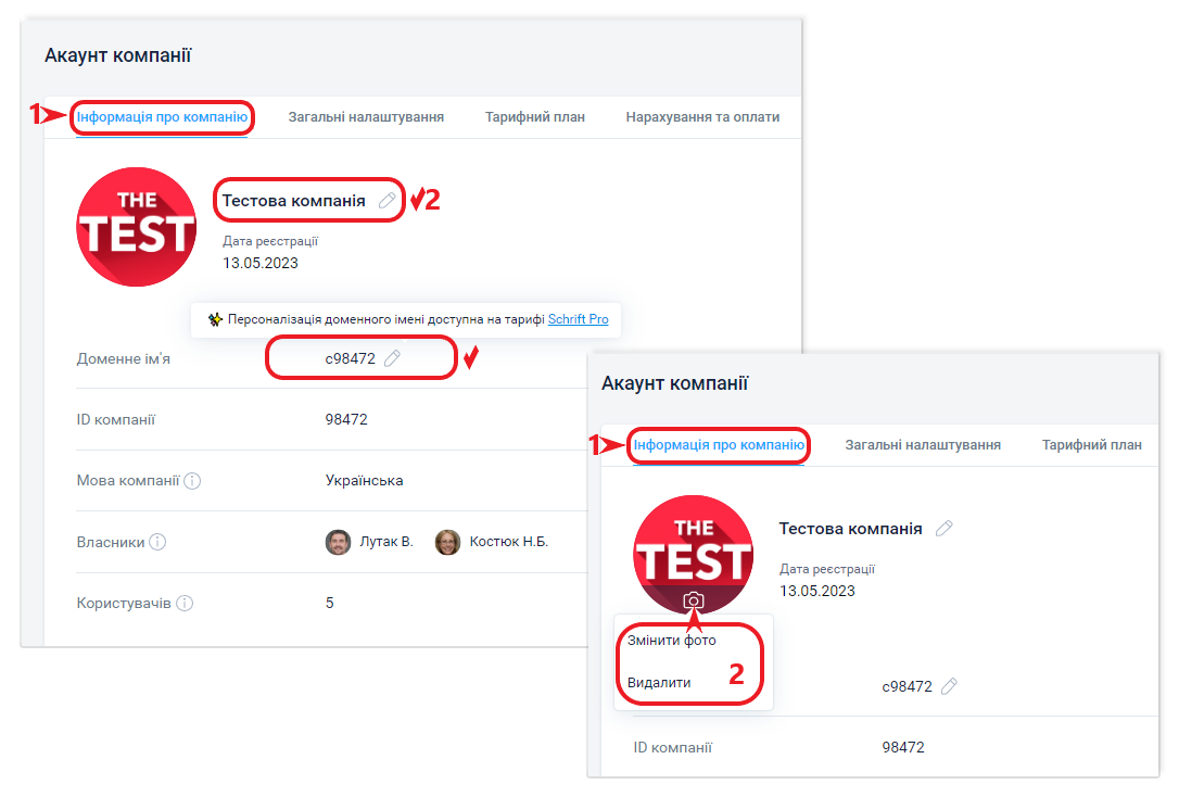 У табі Інформація про компанію міститься вся основна інформація: назва, дата реєстрації в системі, доменне ім'я, співробітники з роллю власника й адміністратора. А також показано кількість користувачів.