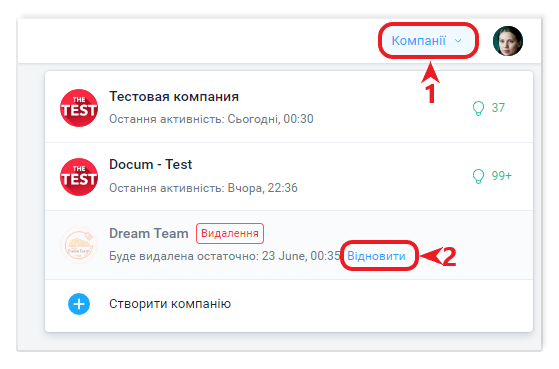 Після виконання дії видалення акаунта компанії, протягом 2 тижнів його ще можна скасувати, якщо видалення було зроблено помилково або Власник передумав. Для скасування видалення співробітнику з роллю Власник достатньо перейти в компанію за посиланням Відновити (див. нижче скрін).