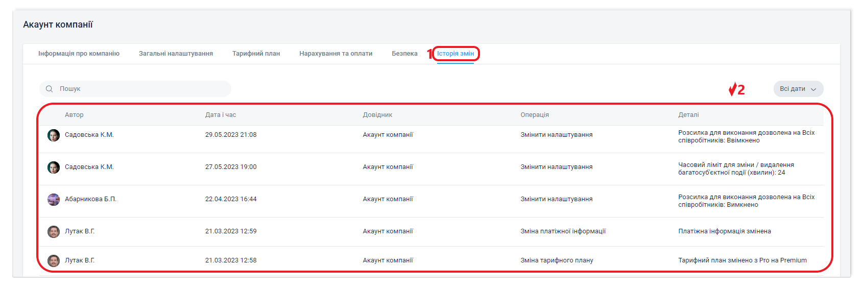 Історія змін акаунта компанії доступна в платних тарифах.