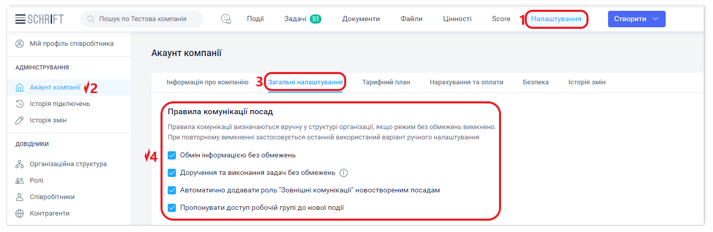 Якщо вимкнути режим "Без обмежень" (зняти позначку з чекбокса), власник компанії або адміністратор повинні будуть підтримувати налаштування правил комунікацій між посадами компанії в довіднику Організаційна структура.