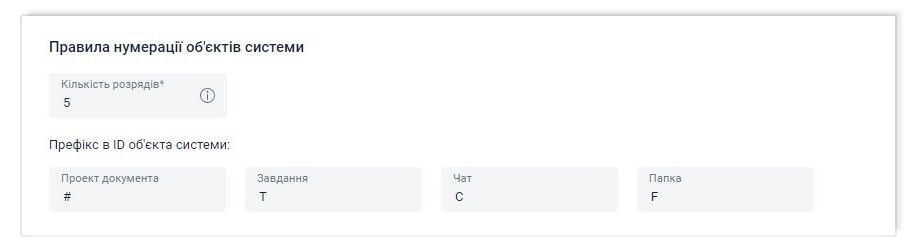 Власник компанії або адміністратор може встановити кількість розрядів та префікс для ID новостворених об'єктів системи.