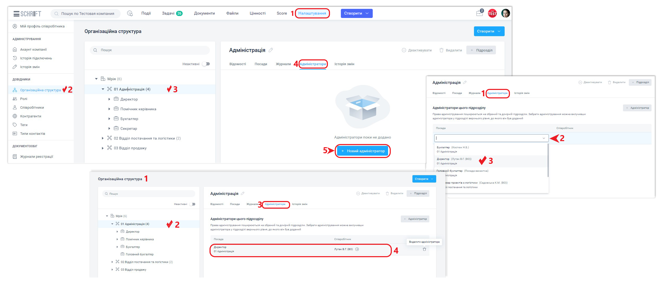 Адміністратор підрозділу має права налаштування стосовно посад і співробітників тільки для того підрозділу, у якому він визначений як адміністратор.