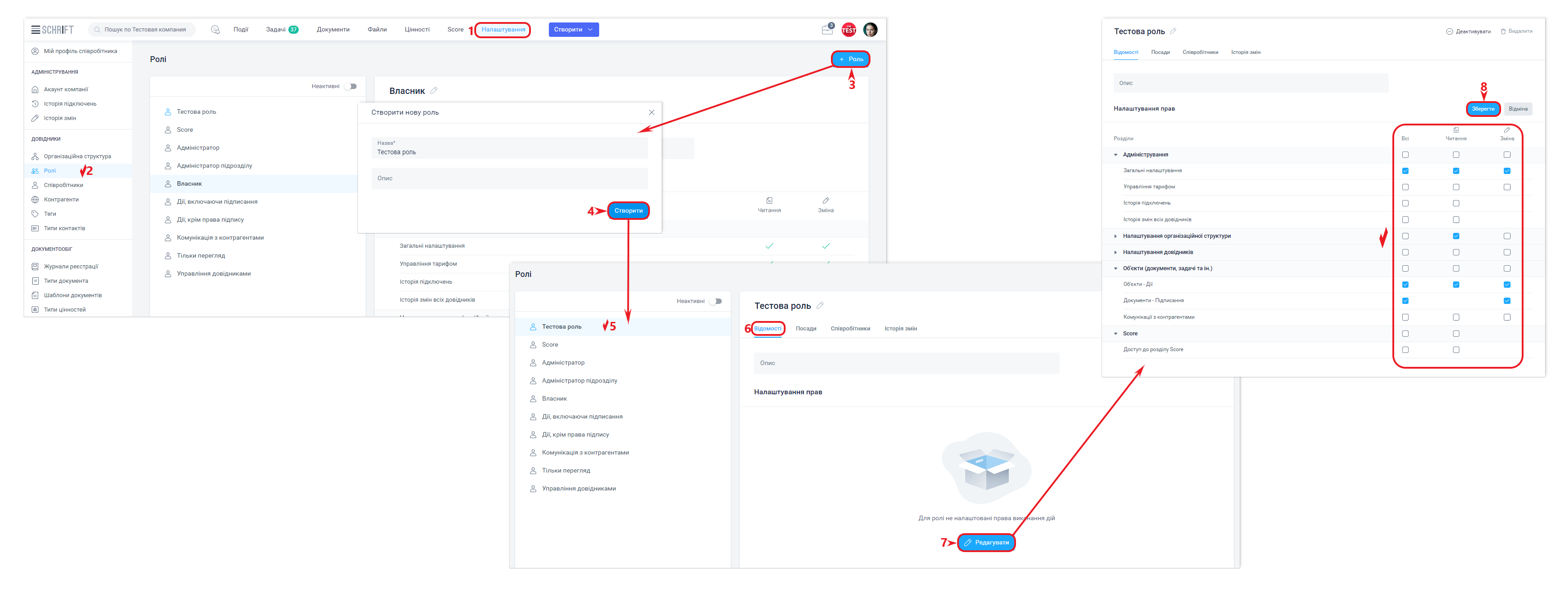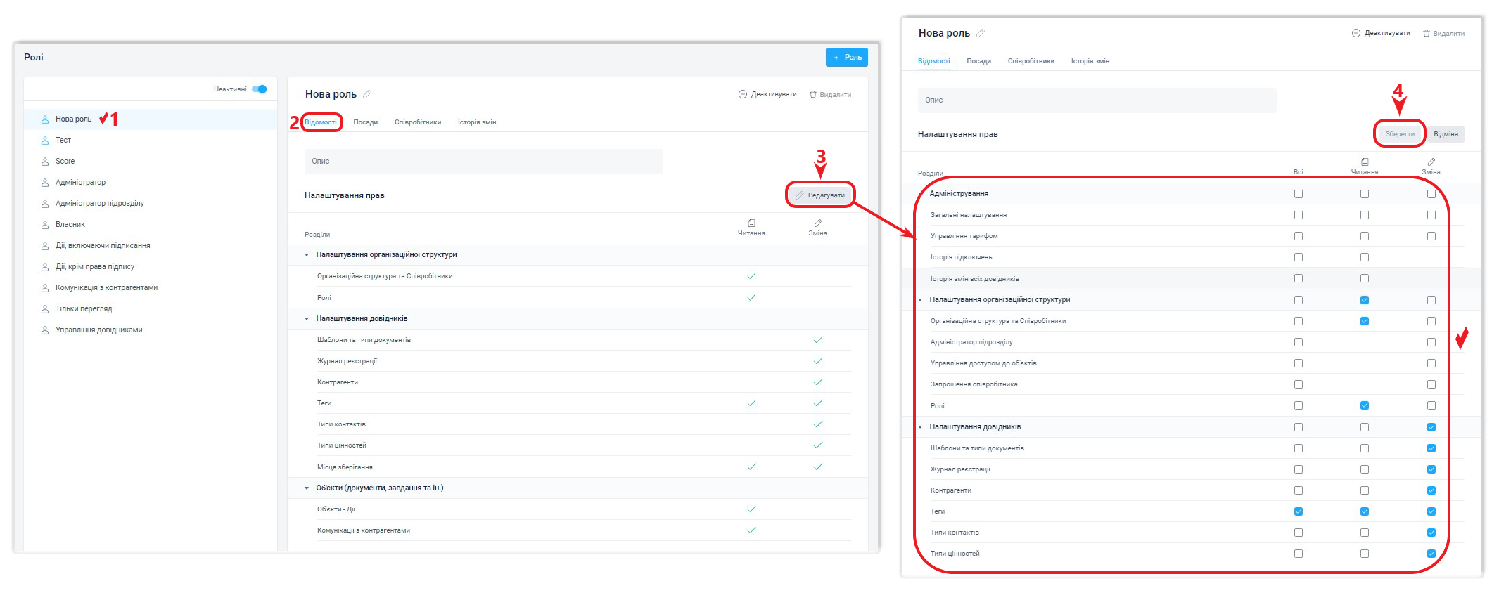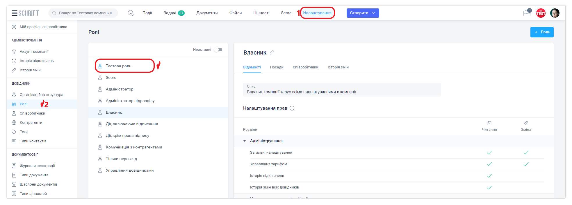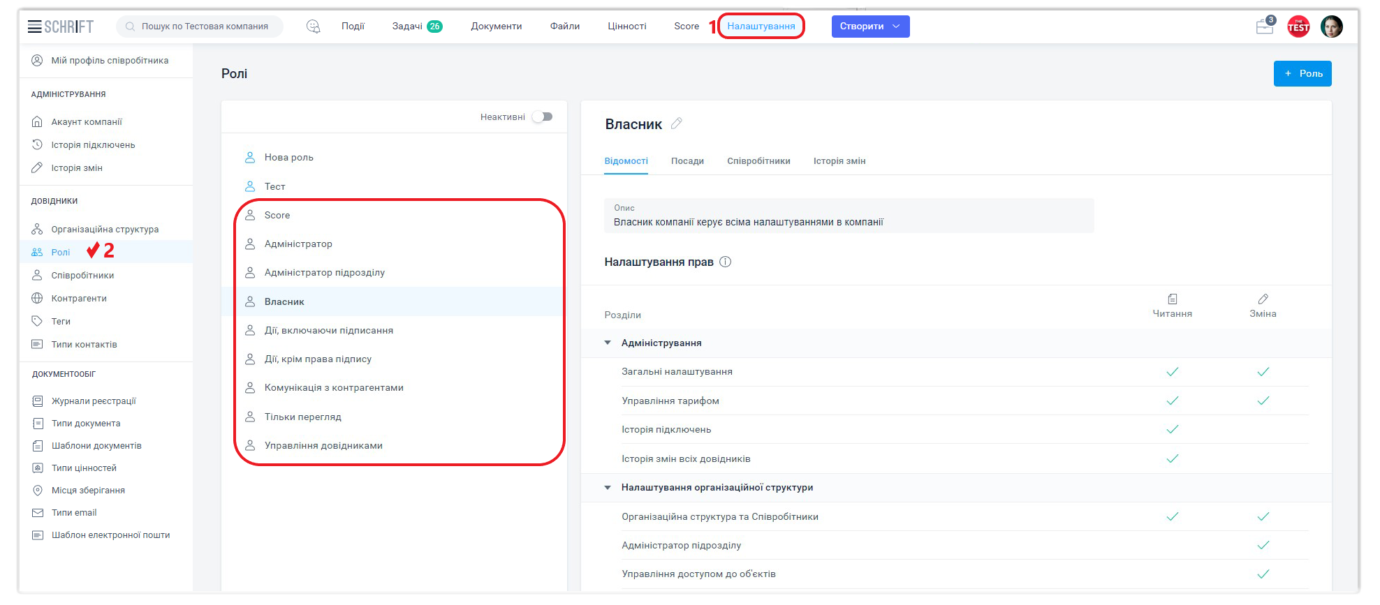 Право перегляду і зміни довідника Ролі, а також надання ролей відповідним посадам, мають співробітники з роллю Власник, Адміністратор та Адміністратор підрозділу (відносно відповідного підрозділу).