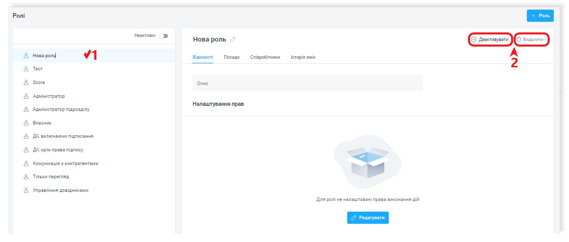 Роль можна деактивувати, якщо вона не використовується в жодній з активних посад компанії. Видалити роль можна, якщо вона не використовувалася в налаштуванні посад. Деактивовану роль можна знову активувати.