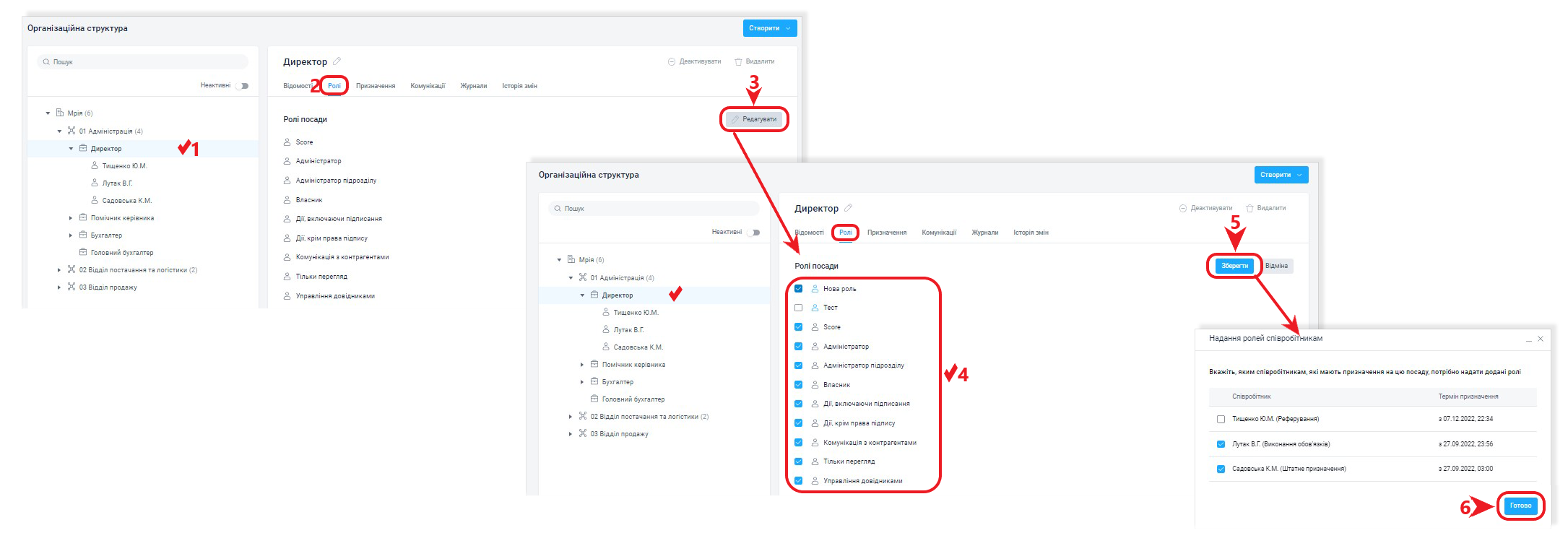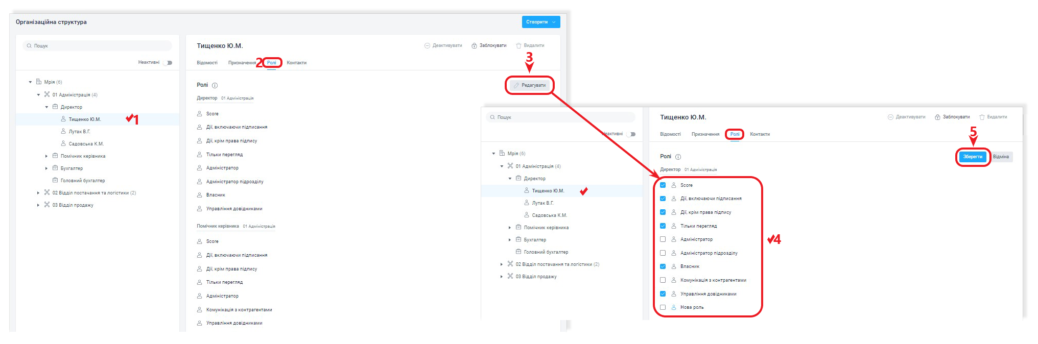 Співробітники, які мають призначення на одну посаду, можуть мати різний склад ролей доступний їм відповідно до їхніх призначень.