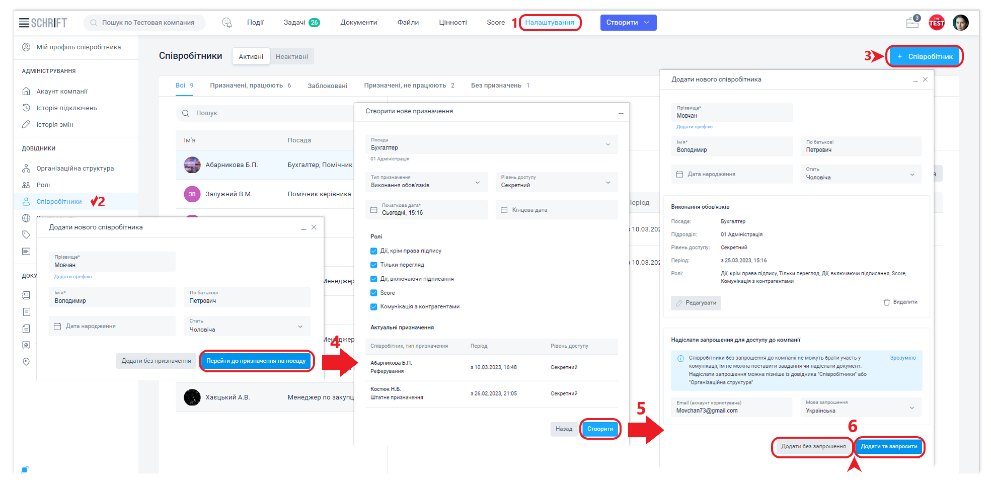 при надсиланні повідомлення, розсилці, відкритті доступу та інших діях в основному інтерфейсі додатка (за наявності відповідної ролі у того, хто додає нового співробітника).