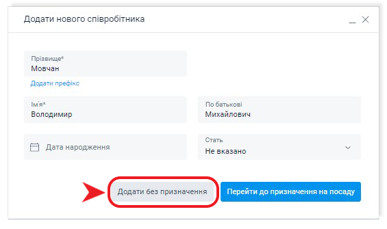 Співробітник може бути доданий без призначення на посаду.