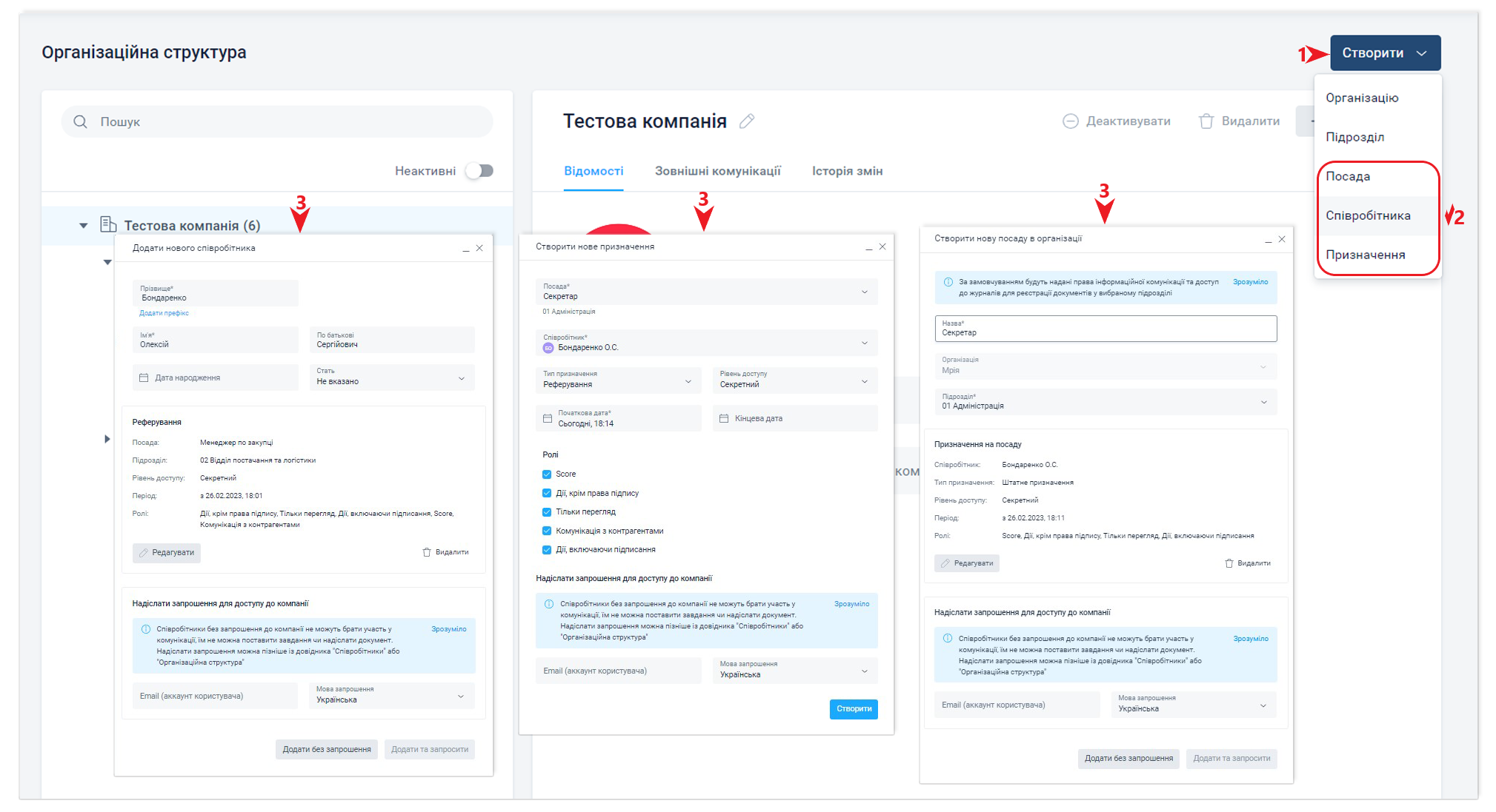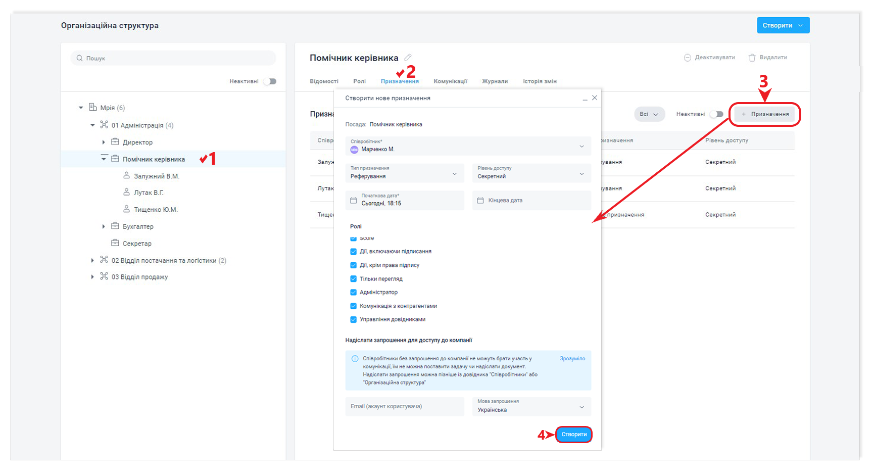 Детально про створення і налаштування посади та призначення, дивіться в статтях Адміністрування компанії та Організаційна структура.