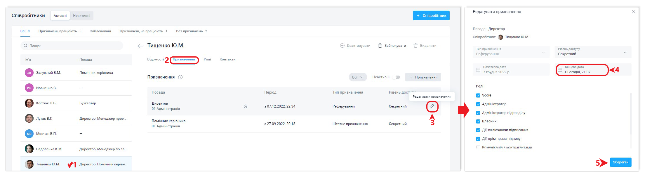Термін дії призначення співробітника можна обмежити, вказавши дату і час закінчення за дією Змінити призначення або Припинити призначення.