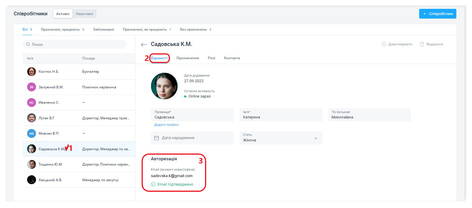 Додавання і зміну даних щодо співробітників, створення, зміну і припинення призначень та інші дії може здійснювати співробітник, який має в компанії відповідну роль.