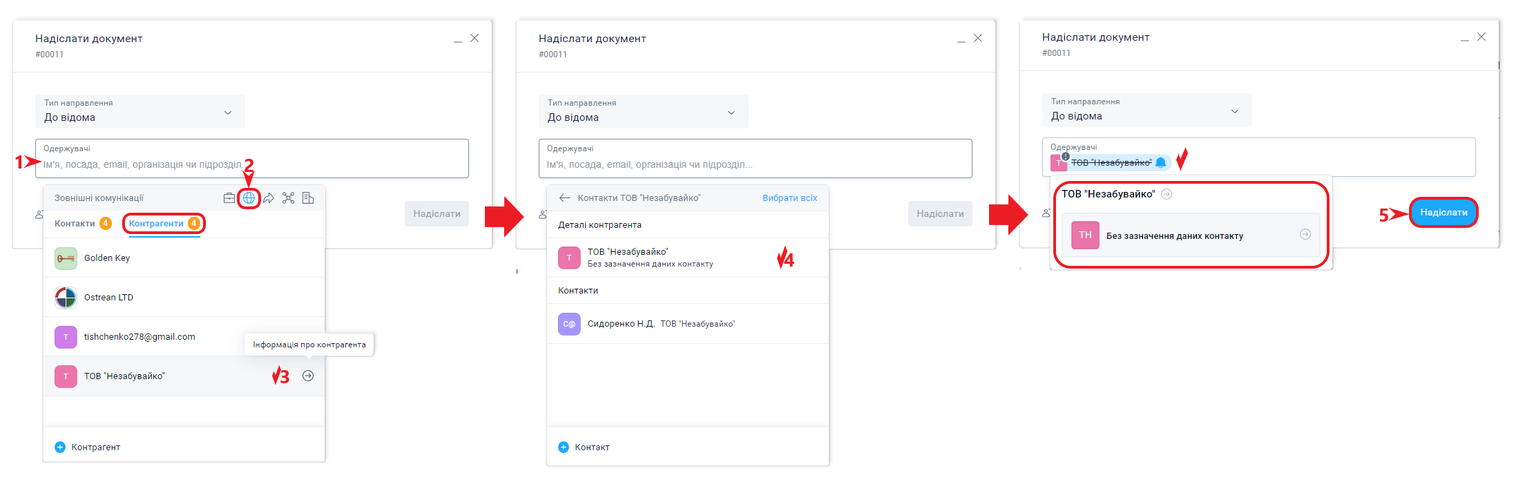 Якщо ви ще не знаєте дані контакту контрагента (ім'я, email, посада тощо.), але вам потрібно надіслати інформацію контрагенту, ви можете вибрати спеціальний вид контакту “Дані контакту не визначені”.