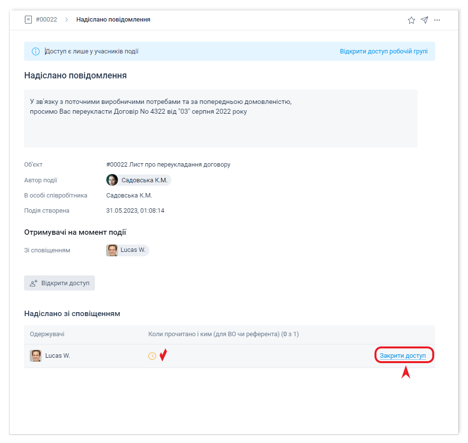 Відкриття доступу до будь-якої події за документом для співробітника або зовнішнього контакту, у якого ще немає доступу до документа, відкриває в такий спосіб доступ не тільки до цієї події, а й до самого документа.