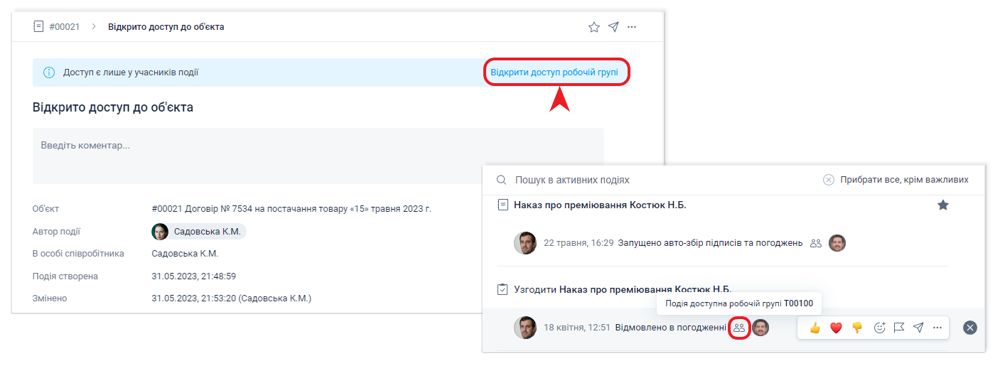 Відкрити доступ до події тим, у кого ще немає до неї доступу, може будь-який співробітник, який має до неї доступ. Система підтримує можливість роздільного доступу до подій у межах комунікації співробітників за одним об'єктом системи.