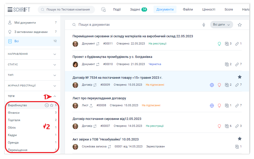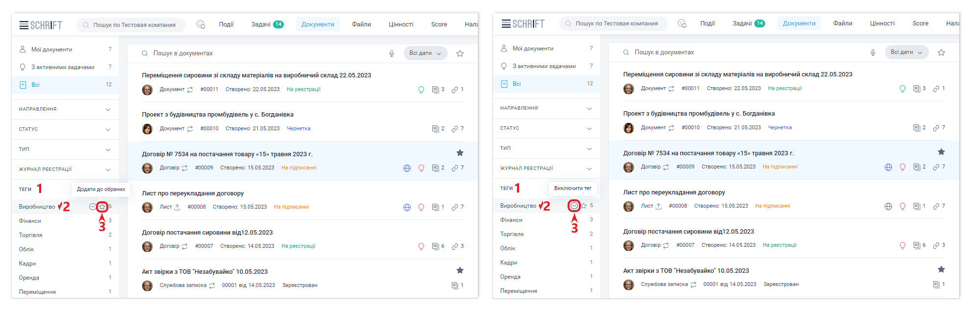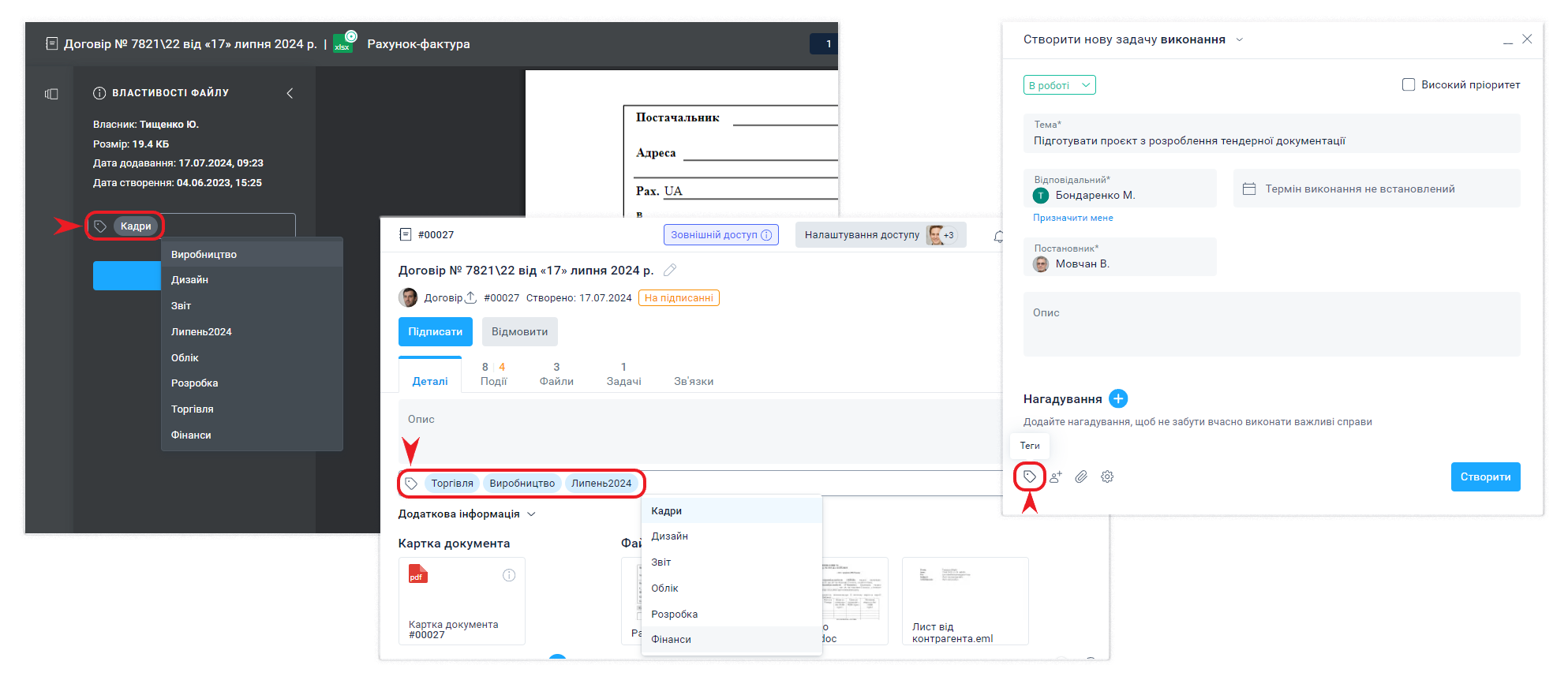 Додавання та видалення тегів у об'єкта доступне всім користувачам, кому доступний сам об'єкт. До об'єкта можна додати будь-яку кількість тегів. Тег, доданий до документа одним співробітником, буде доступний всім іншим співробітникам, кому доступний цей документ. Надалі це полегшує і прискорює процес пошуку необхідної інформації для всіх користувачів і кожен співробітник створює користь для всіх співробітників. Тому користувачам рекомендується додавати теги, щоб полегшити процес пошуку собі і своїм колегам.