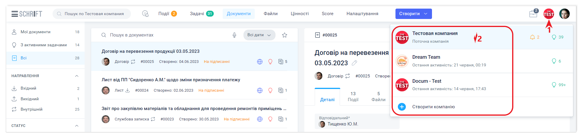 Перейти до тестової компанії можна в будь-який час зі списку компаній в інтерфейсі однієї з компаній або з акаунта користувача.