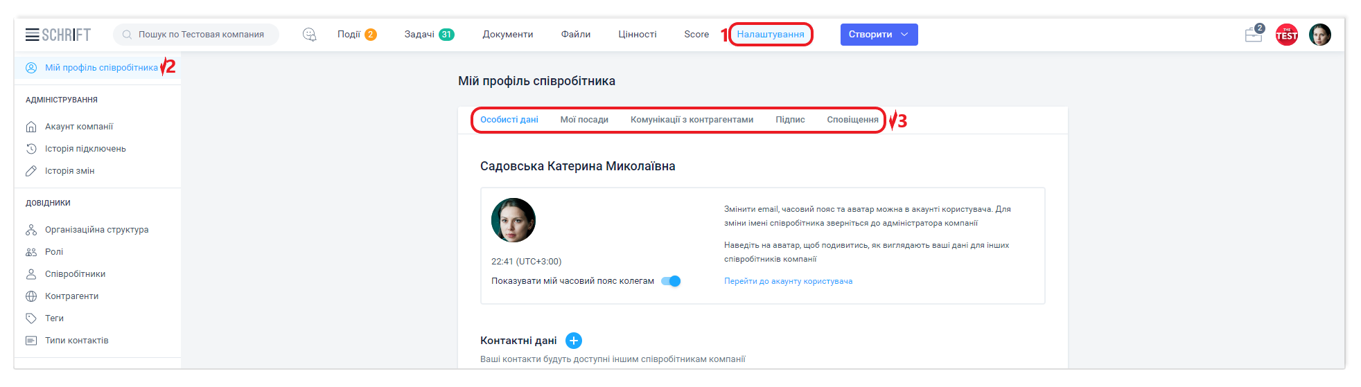 Профіль співробітника дає можливість налаштувати все, що необхідно користувачеві для роботи як співробітника саме в цій компанії: делегування своїх посад, управління комунікацією із зовнішніми контрагентами, створення факсиміле підпису, налаштування сповіщень на пошту та інше.