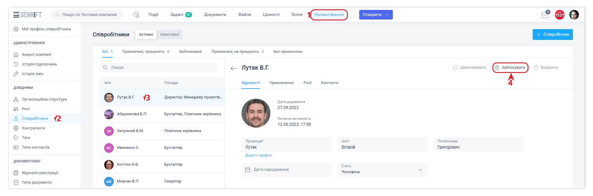 Про логіку системи Шрифт: компанія - посада - призначення - співробітник - користувач, читайте в статті Адміністрування компанії.