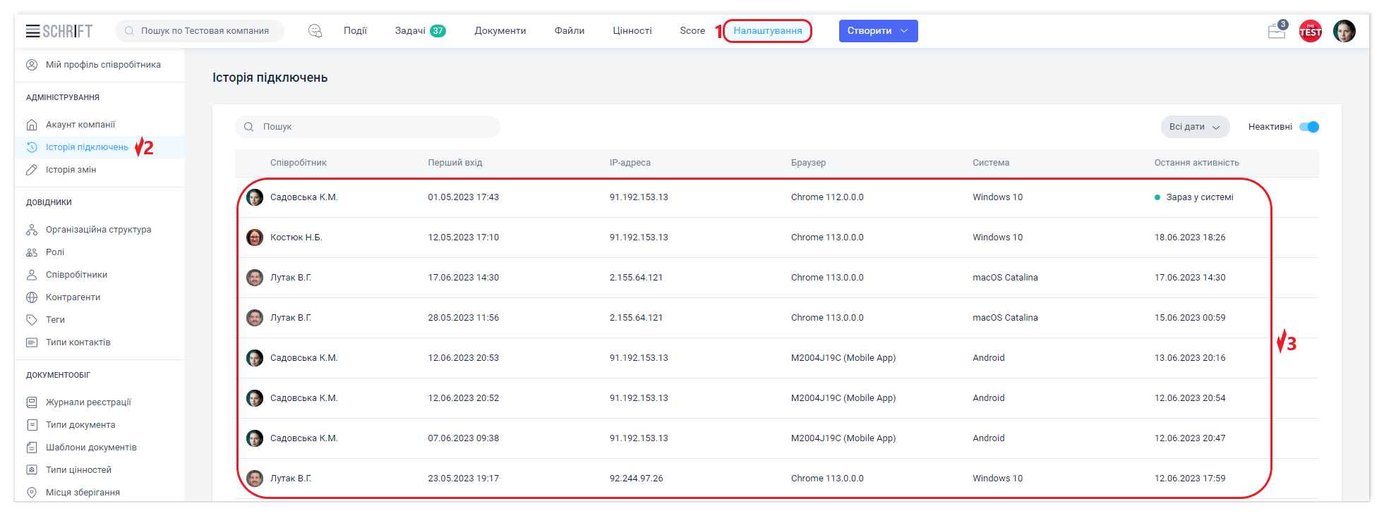 В акаунті компанії доступна історія підключень співробітників з інформацією про пристрої та локації, з яких виконувалися підключення, а також історія змін у всіх довідниках розділу Налаштування.