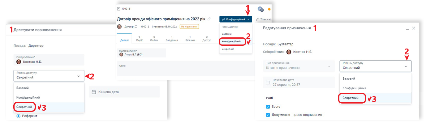 Гнучке налаштування доступу шляхом встановлення одного з трьох рівнів доступу до даних (базовий, конфіденційний і секретний) на рівні призначення співробітника і на рівні об'єкта системи дає можливість захистити конфіденційні та секретні документи, а також обмежити доступ референта або виконуючого обов'язки до інформації доступної посади.