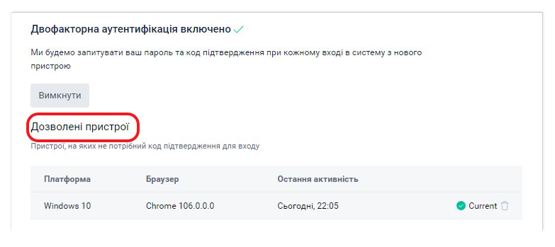 Після увімкнення 2FA будь-який ваш вхід у систему Шрифт на новому пристрої вимагатиме крім логіна та пароля, також код 2FA з мобільного додатку. Ви можете додати новий пристрій до списку дозволених, на яких не потрібно вводити 2FA код після кожної нової авторизації (введення логіна і пароля). Списком дозволених пристроїв можна керувати, видаляючи з нього ті, що вже неактуальні.