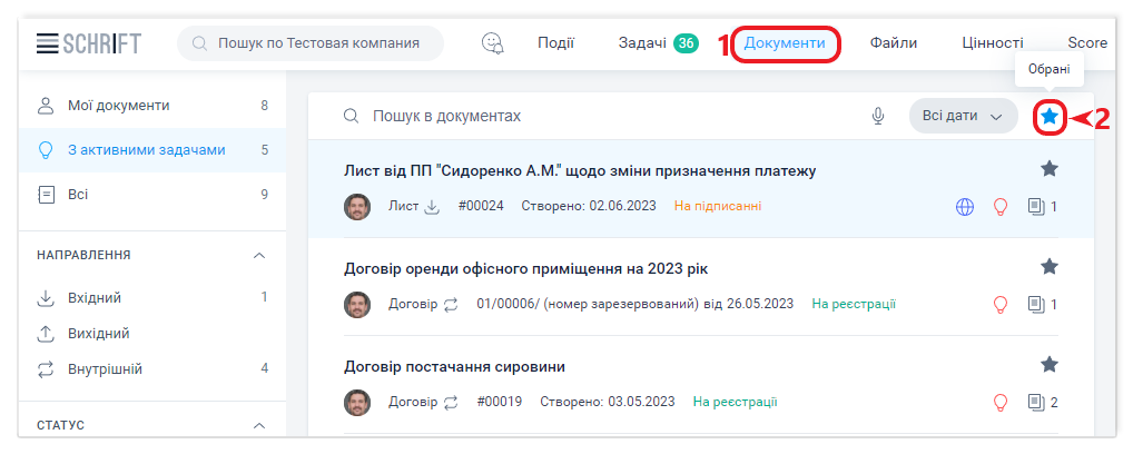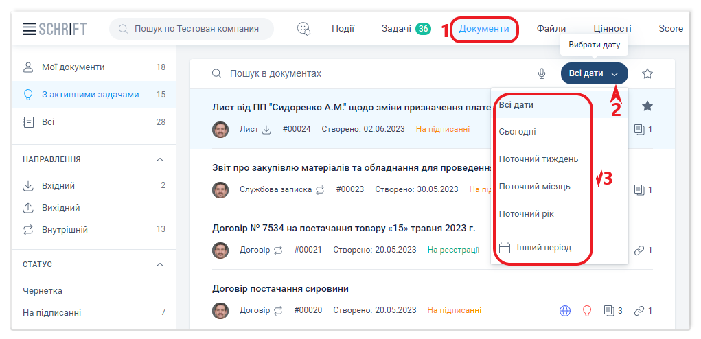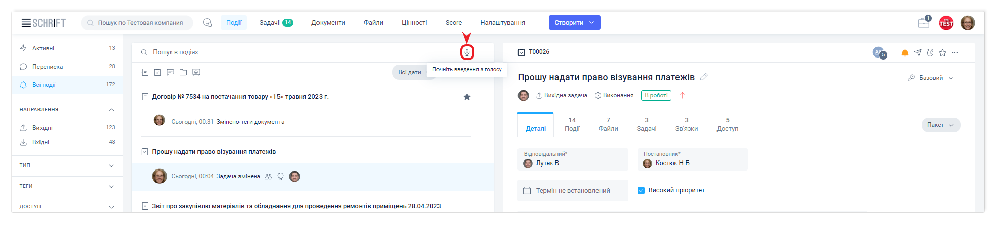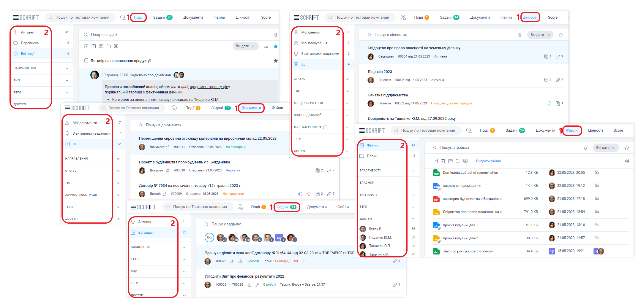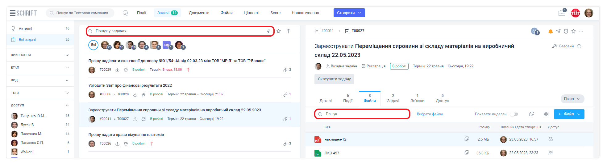 Під час пошуку потрібної події, файлу або об'єкта можна вказати, до якого типу об'єкта вони належать (задача, документ, чат, папка, цінність).