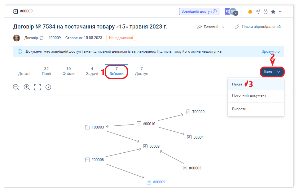 Цей фільтр відображається, якщо в об'єкта є зв'язки, та використовується для того, щоб побачити події, файли, задачі і дані доступу тільки для обраних об'єктів зі складу пов'язаних об'єктів, які входять до пакету.