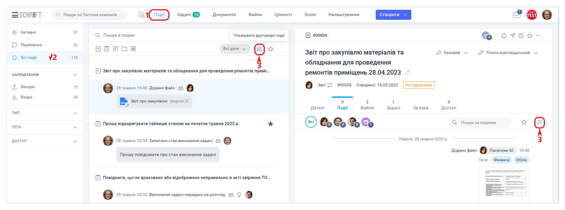 Фільтр за замовчуванням показує тільки основні події. Для відображення всіх подій, включно з другорядними, потрібно натиснути на іконку "Показати другорядні".